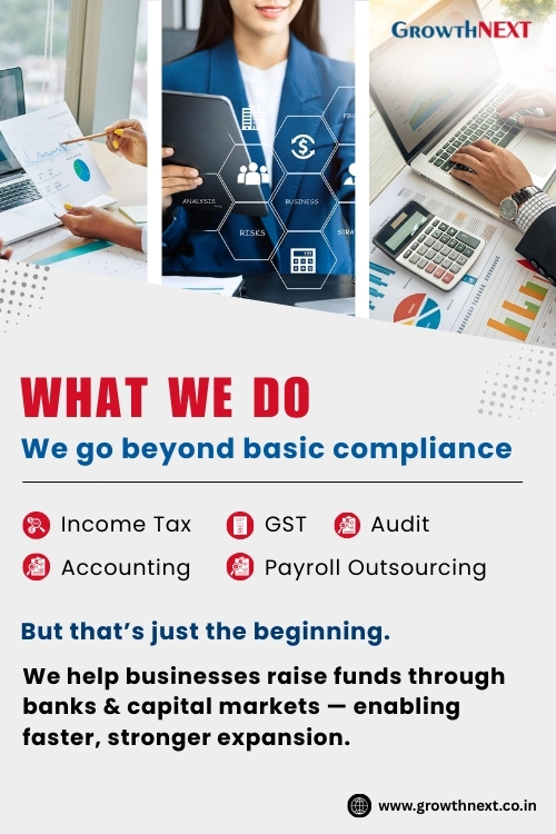 At GrowthNEXT Consultants, we empower businesses to make data-driven decisions through expert financial services. As trusted financial advisors in Thane, we provide tailored solutions for financial planning, taxation, and growth strategies. Our services go beyond Income Tax, GST, Audit, Accounting, and Payroll Outsourcing, helping businesses raise funds via banks and capital markets to drive faster growth.